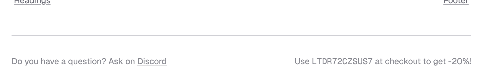 {% extends "!partials/article_footer.html" %} {% block article_footer_left %} <p>Do you have a question? Ask on <a href="https://discord.gg/uaEa43HB">Discord</a></p> {% endblock %} {% block article_footer_right %} <p>Use <code>LTDR72CZSUS7</code> at checkout to get -20%!</p> {% endblock %}
