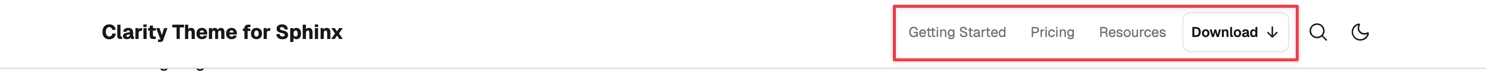 html_theme_options = { "header_menu": [ { "label": "Getting Started", "url": "some/url", }, { "label": "Pricing ", "url": "some/url", }, { "label": "Resources", "url": "some/url", }, { "label": """Download <svg xmlns="http://www.w3.org/2000/svg" width="16" height="16" viewBox="0 0 16 16" fill="none" stroke="currentColor" stroke-width="1.5" stroke-linecap="round" stroke-linejoin="round" aria-hidden="true" focusable="false"><path d="M8 3v8"/><path d="M3.5 8.5L8 13l4.5-4.5"/></svg>""", "url": "some/url", "as": "button", }, ], }