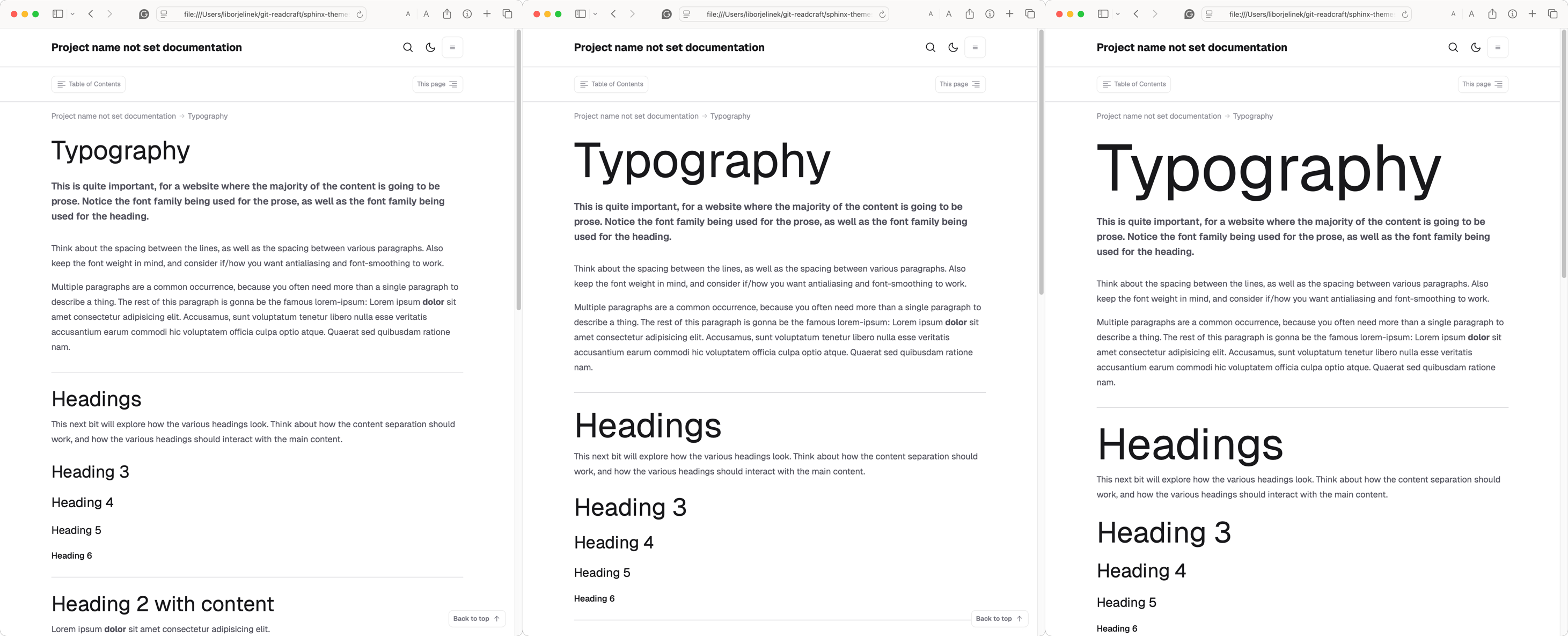 Ratios that are too large or too small make headings feel disjointed or indistinct. Recommended ratios for documentation typically range between 1.125 and 1.333. In Clarity Theme for Sphinx the scale is controlled by the --article-heading--scale CSS variable.